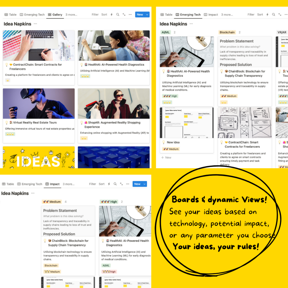 - Dynamic Categorization: Categorize your ideas based on technology, potential impact, or any parameter you choose. Your ideas, your rules!