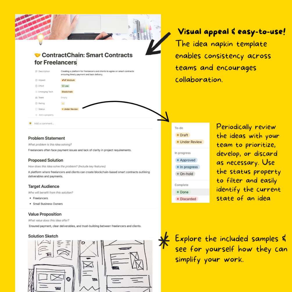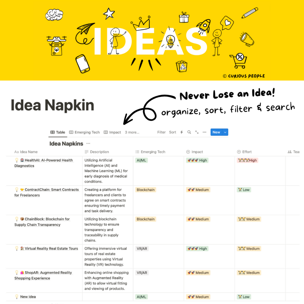 But Idea Napkins is more than just a Notion template—it's where your embryonic ideas get the nurturing soil to sprout and flourish. It's a crucial part of our Innovation Bundle, designed to seamlessly integrate with other Notion templates to fuel a culture of continuous innovation in your organization.